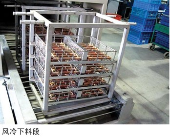 Basic composition:It consists of cleaning section, transition section, drying furnace section, air-cooled feeding section, feeding trolley, hanging basket and electrical control system.